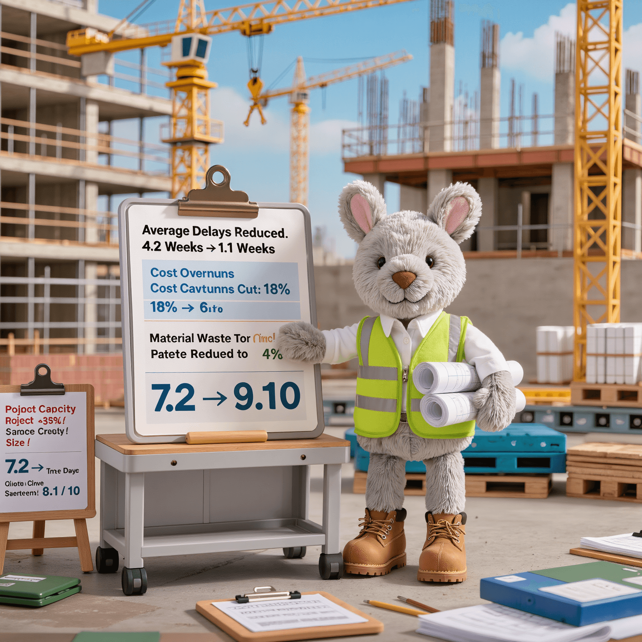 We reduced average project delays from 4.2 weeks to 1.1 weeks, cut cost overruns from 18% to 6%, and decreased material waste to 4%.
